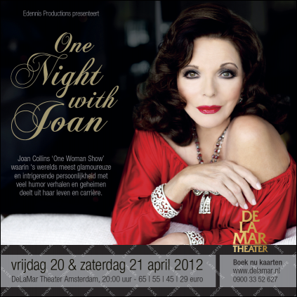 Joan had a wonderful first night in Amsterdam, with a most appreciative audience and she was thrilled with the response. I was not due to attend last night, however last minute change of plans and I got a spare seat in the balcony.. I will be attending from a nearer vantage point tonight, will report on that tomorrow evening! Among the celebrity audience was Joan's former 'Dynasty The Reunion' co-star Jereon Krabbe, who met Joan after the show.. A wonderful night was had by all!